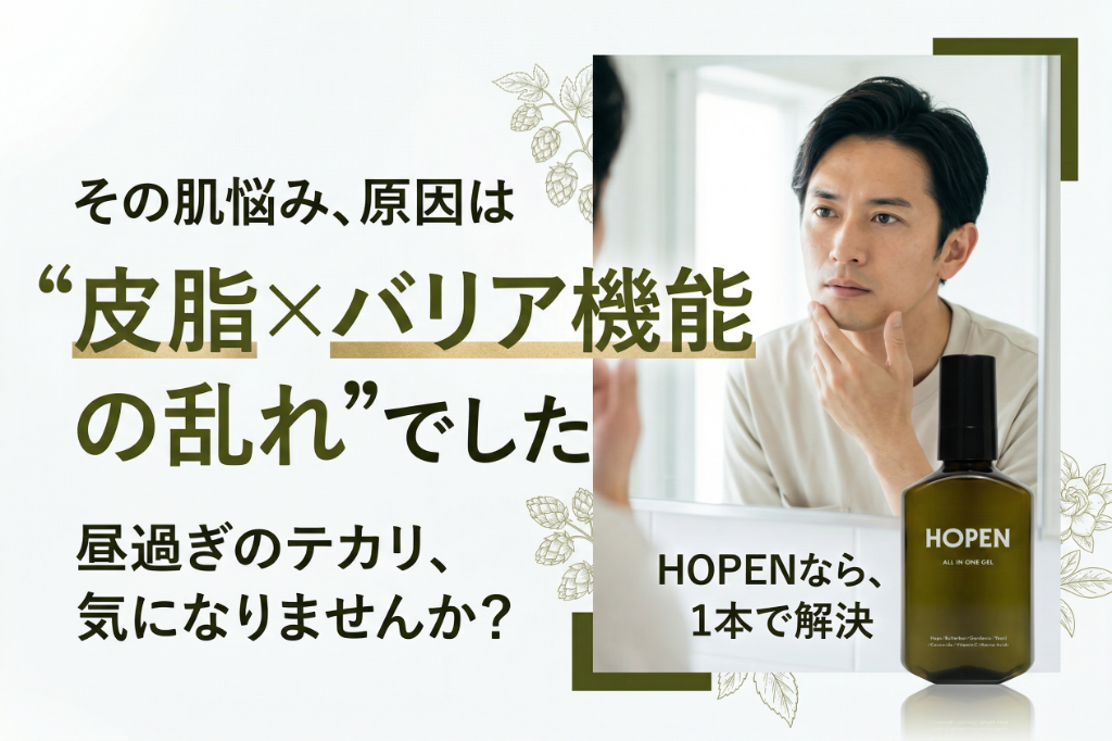 「HOPEN」は、Hops(ホップ)、Butterbur(ふきのとう)、Gardenia(クチナシ)、Yeast(酵母)、Ceramide(セラミド)、Vitamin C(ビタミンC)、Amino Acids(アミノ酸)といった自然由来・先端科学の成分を掛け合わせ、男性の肌をすこやかに整えるスキンケアブランドです。