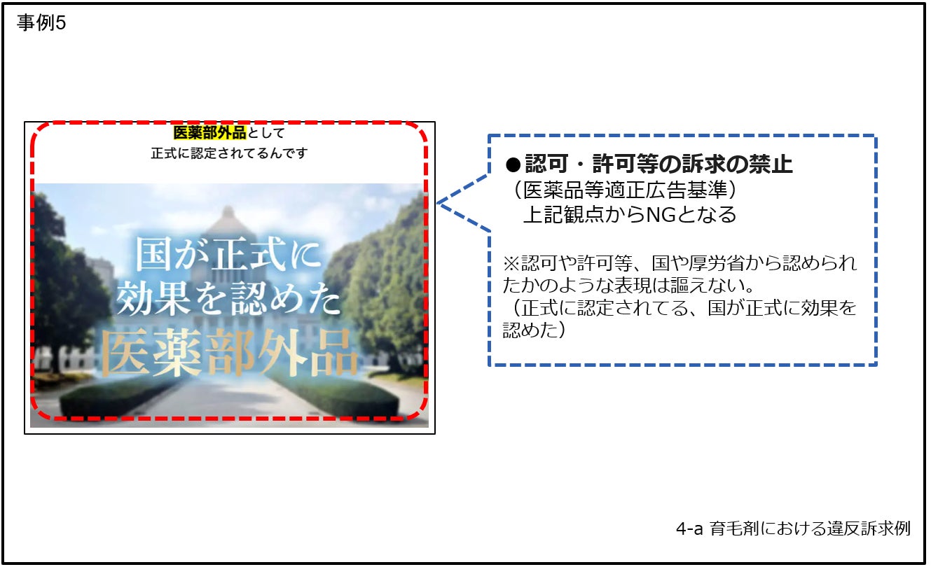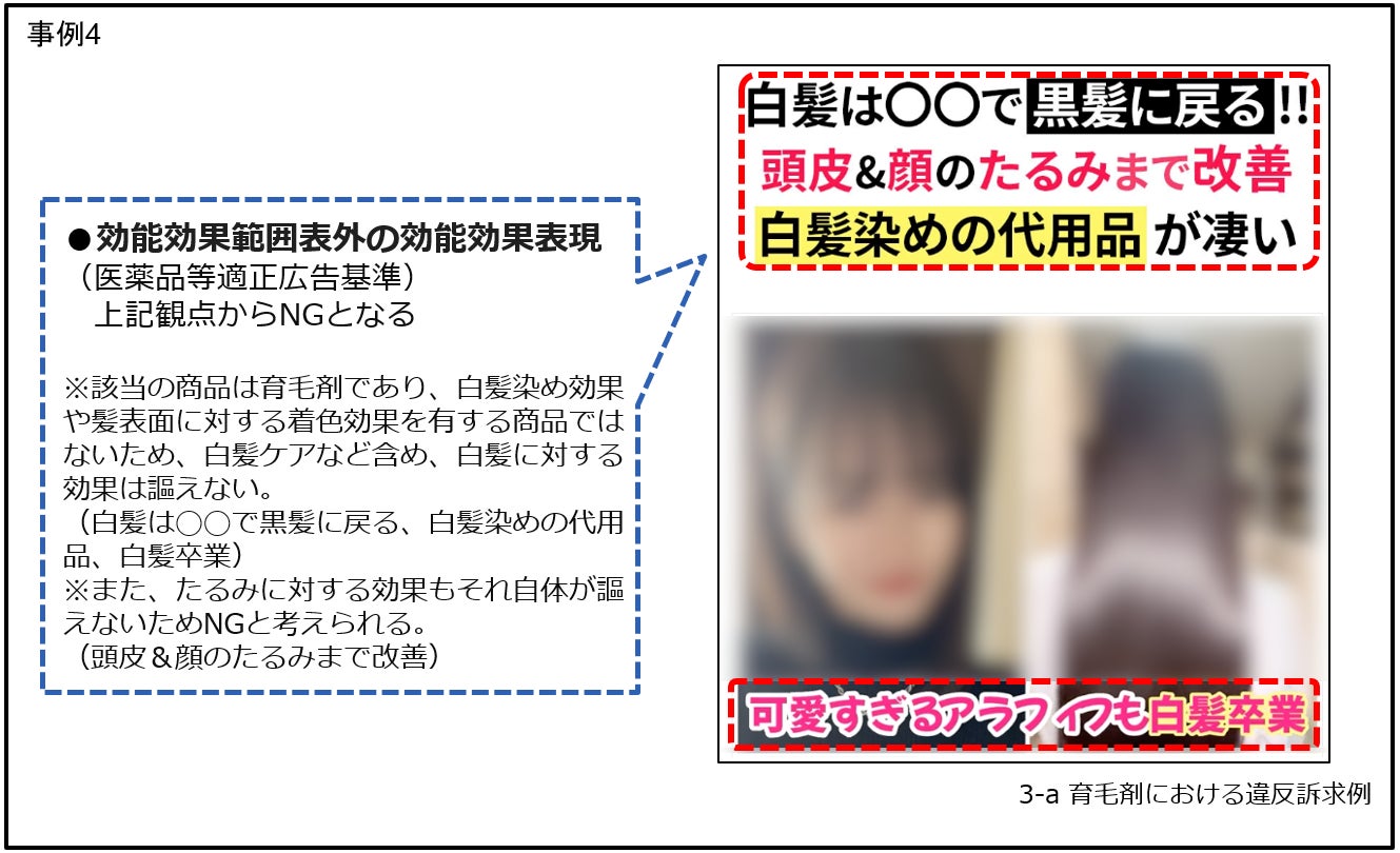 例6:育毛剤において、塗る植毛、誰にもバレずに生やせる、などの表現や、BA画像により、あたかも髪が生えるかのような表現。また白髪が生えてこなくなる、白髪ケア、などの白髪に効果があるかのような表現。