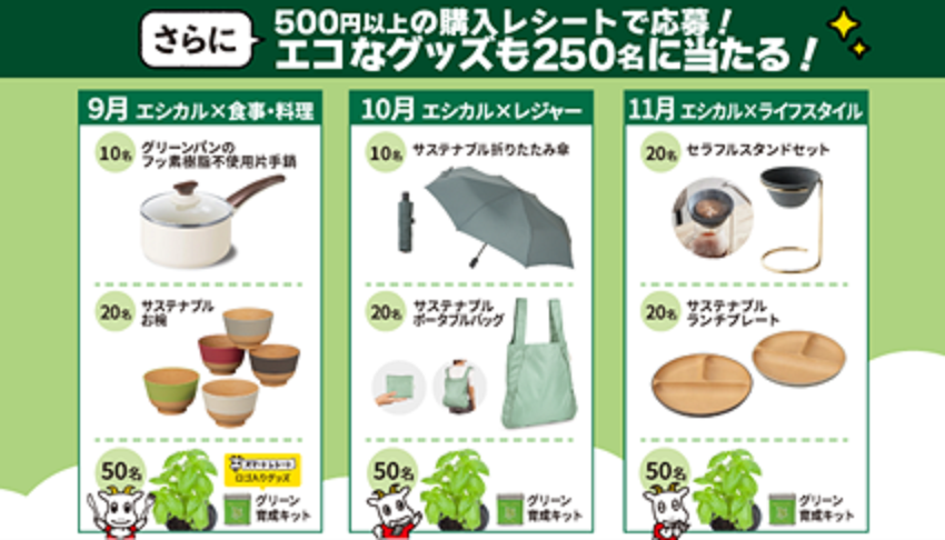 本キャンペーンは、2023年9月1日から11月30日までの期間、キャンペーンの趣旨に賛同いただいた全国の小売企業と合同で開催し、対象店舗で「スマートレシート®」を利用することでエシカルグッズが当たる抽選に応募できるキャンペーンです。毎月変わるグッズには自然環境に配慮した食器やバッグ、折り畳み傘、「スマートレシート®」のロゴ入り「グリーン育成キット」など“エシカルライフ”に沿った商品を用意しています。「スマートレシート®」は参加企業を拡大し、今後も継続的にキャンペーンを実施していきます。