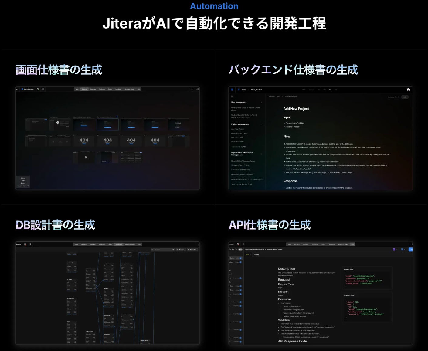 システム改修の自動化、システム設計書の自動作成を実現する開発AIエージェント「Jitera」。設計情報・ソースコードの自動生成や、AIチャット機能を目の前で体感できるデモ解説も行います。