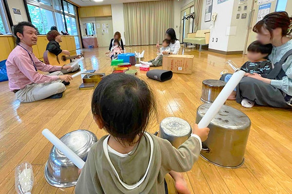 普段身の回りにある物を「太鼓」にしてリズム遊びをしながら、ギターの生演奏に合わせてみんなでうたを歌う内容で、昨年に続き2回目の開催です。
