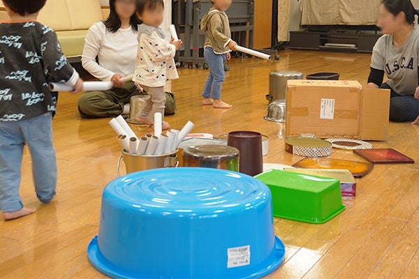 最初は一つの太鼓で遊んでいたお子さまも、慣れてくるといろいろな太鼓を叩き比べたり、一列に並べた太鼓を端から順番に叩いて遊ぶなど、子どもならではの発想で楽しんでいました。