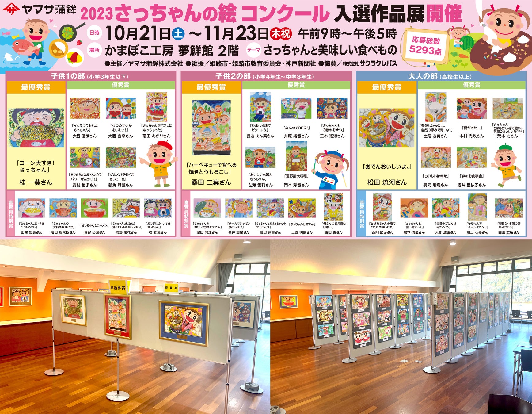 ヤマサ蒲鉾株式会社(兵庫県姫路市/代表取締役社⻑:名⽥和由)は、イメージキャラクター「さっちゃん」を題材に絵のコンクールを実施しておりました。今年は「さっちゃんと美味しい食べもの」をテーマに全国から5293点の応募がありました。受賞した作品を多くのお客様に見て頂くために、ヤマサ蒲鉾直売店「かまぼこ工房 夢鮮館」2階にて展示会を行っております。最優秀賞3作品、優秀賞15作品、審査員特別賞15作品を含む、165作品を展示しております。ホームページ上でも受賞作品を確認することができます。