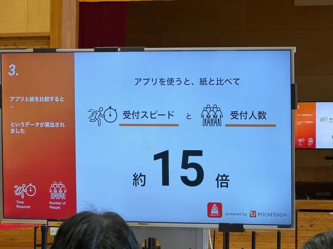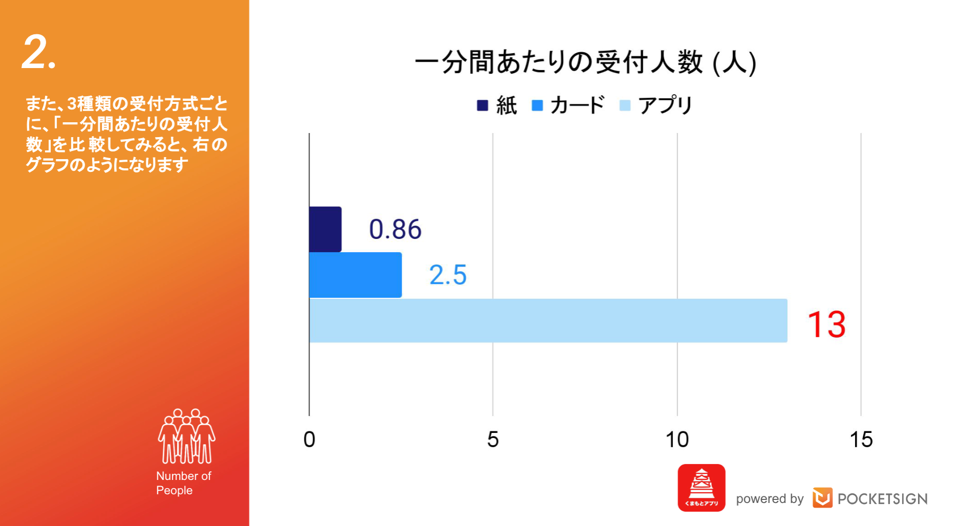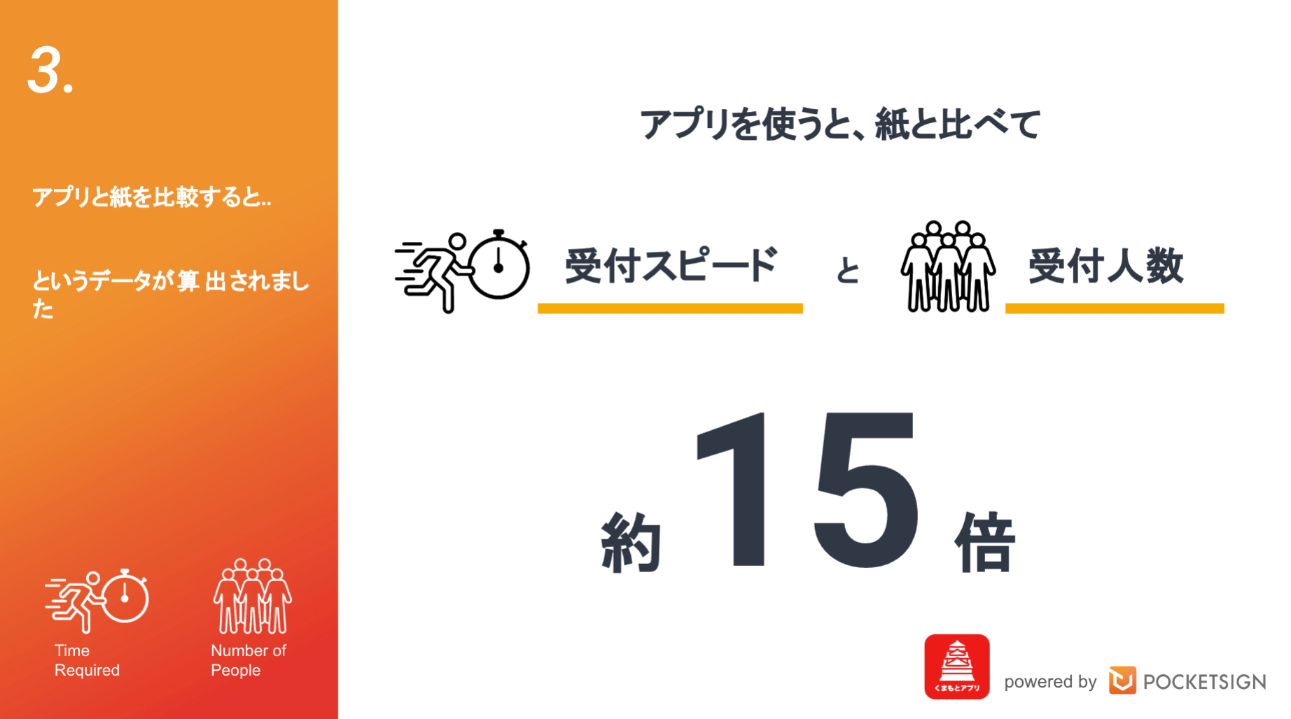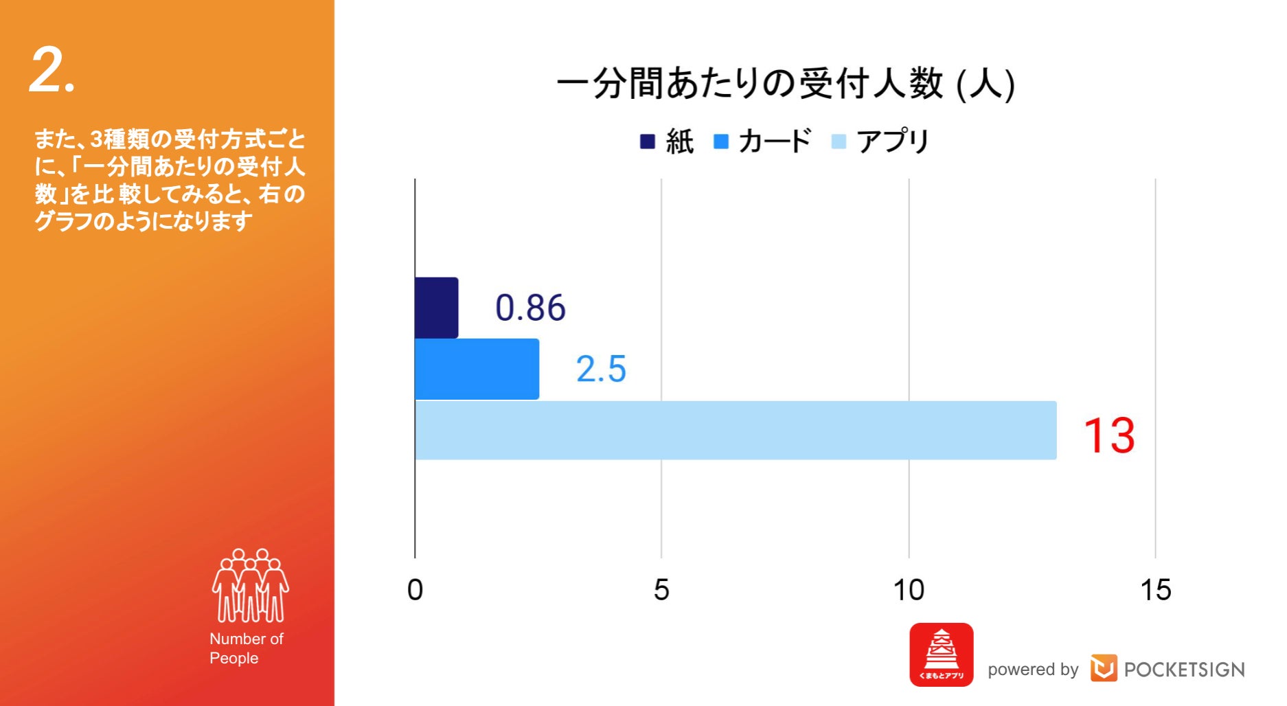 1分あたりの受付人数を比較すると、紙が0.86人、マイナンバーカードが2.5人、「くまもとアプリ」が13人という結果になりました。「くまもとアプリ」を使用することで、紙と比べて受付スピードと受付人数が約15倍に向上することが実証されました。