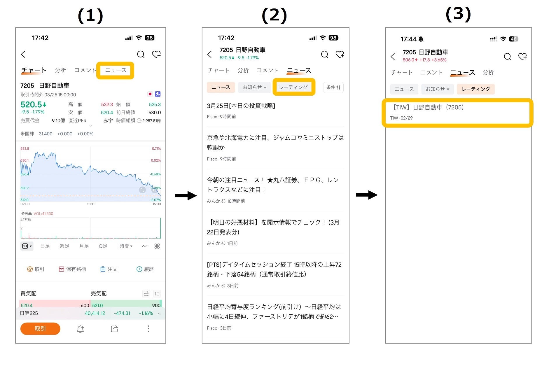(1) 銘柄名、銘柄コード等から各銘柄のページに入ります。 上部の「ニュース」をタップしてください。