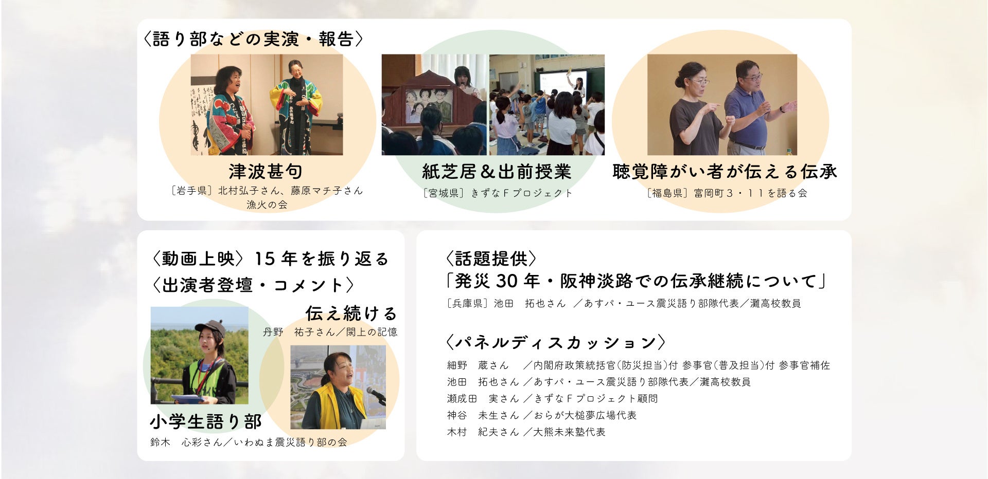 これまでの15年間をふりかえり、岩手・宮城・福島・兵庫のいまの取り組みを共有し、これからを展望する