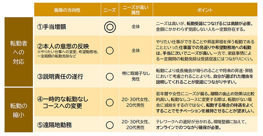 その他、遠隔地勤務や一時的な転勤なしコースへの変更といった施策も考えられる。ただし、どちらもニーズが女性や若年男性に偏ることから、万人受けする施策ではない。遠隔地勤務は、テレワークに対する個人の選好も異なる。孤独感への不安も多く挙がることから、遠隔地勤務を行うには、テレワーク環境の整備に加えて、オンラインでの定期的なミーティングやチームビルディングなどで人間関係の構築を支援することもポイントになりそうだ。また、一時的な転勤なしコースへの変更は離職防止効果が見込まれるが、転勤なしコースに変更する際に減給をするのではなく、転勤する場合の待遇をよくすることでモチベーションを維持させることが望ましい。