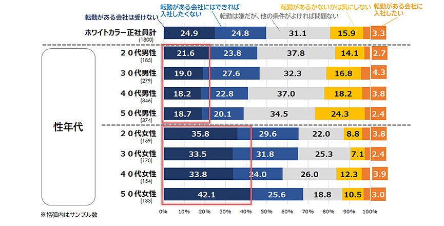 2. 社会人の中途入社意向を性年代別で見ると、どの年代においても、女性では3割以上、男性では2割前後が「転勤がある会社は受けない」と考えている。
