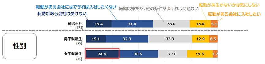 1. 就活生の入社意向を性別で見ると、女子学生の約4分の1が「転勤がある会社は受けない」意向をもつ。