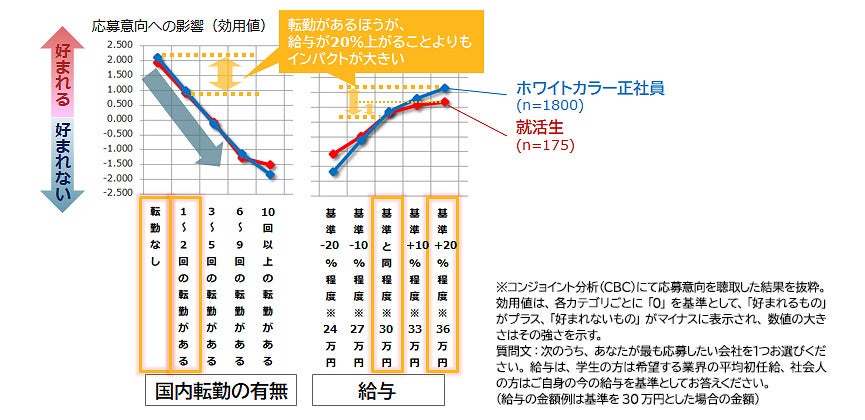 「転勤1~2回」は、「転勤なし」と比べて応募意向への影響(効用値)が1.0~1.1下がる。「現在の給与」(就活生においては希望する業界の平均初任給)と、「現在より20%高い給与」(給与が30万円の場合は6万円のアップ)では、応募意向への影響(効用値)に約0.4~0.8の差しかない。つまり、給与の増額よりも転勤があるほうが大きな影響力をもつ。転勤回数が6~9回までは、転勤回数が増えるにつれて選好度が大きく低下する。