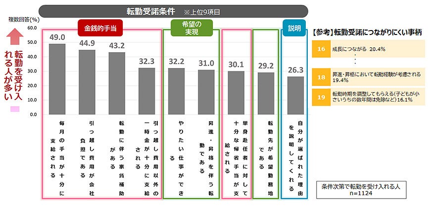 転勤を受け入れる条件は、「金銭的手当」、「本人の希望の実現」、「理由の説明」が上位に