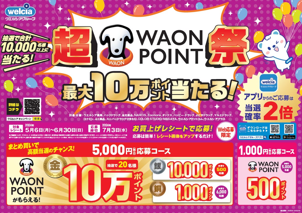 ウエルシアは、2024年5月1日よりイオンのグループ会社としてイオンの共通ポイントであるWAON POINTを中心に、お客さまの利便性向上に繋がるポイントサービスを提供しています。この度、「超WAON POINT祭」を開始することで、お客さまに毎日のお買い物をいっそうお楽しみいただきたいと考えております。