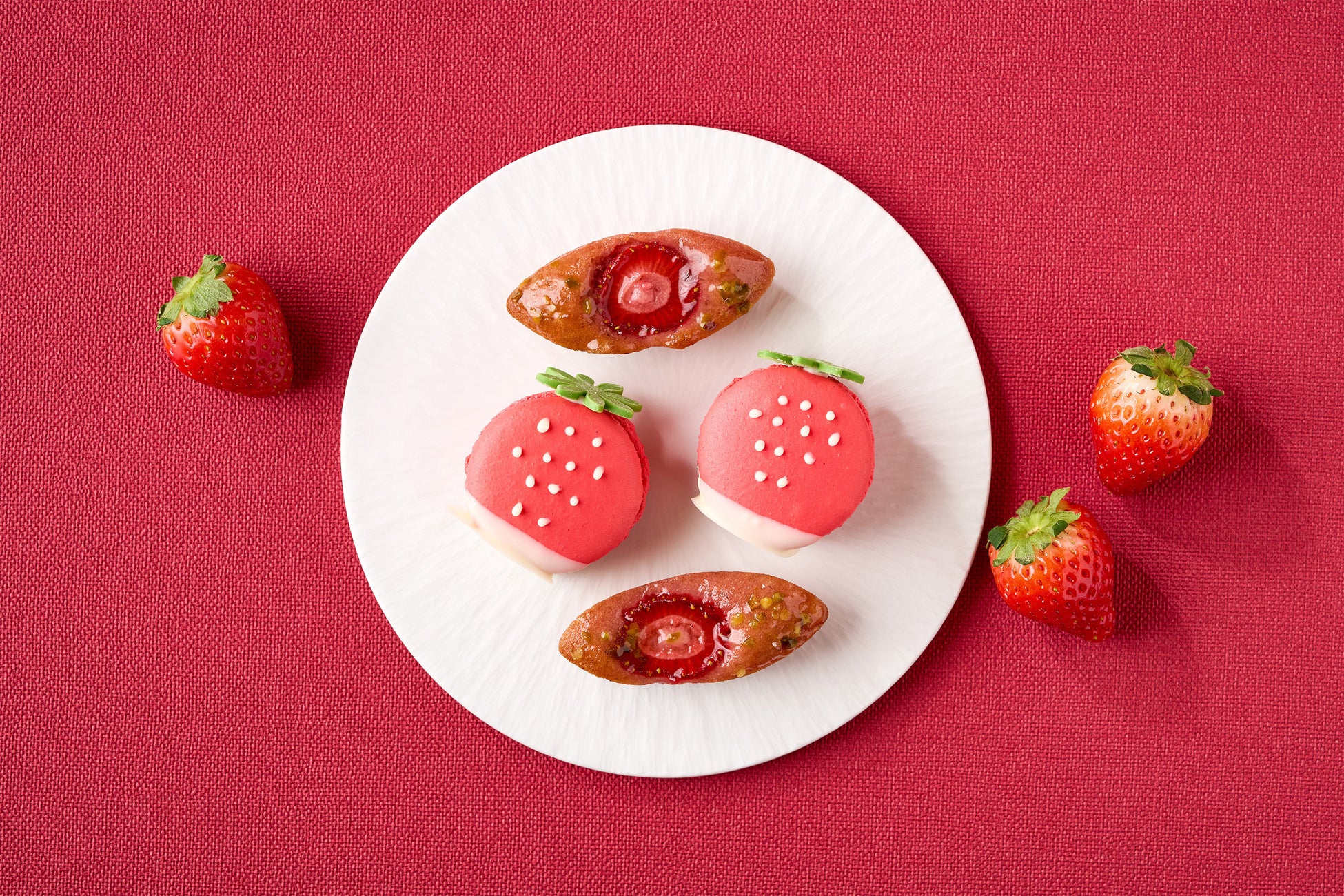 「紅ほっぺ」のコク深い甘酸っぱさを生かしたいちごソースと、クリームチーズのフィリングをいちご型のマカロンにサンド。見た目も可愛らしい一品です。