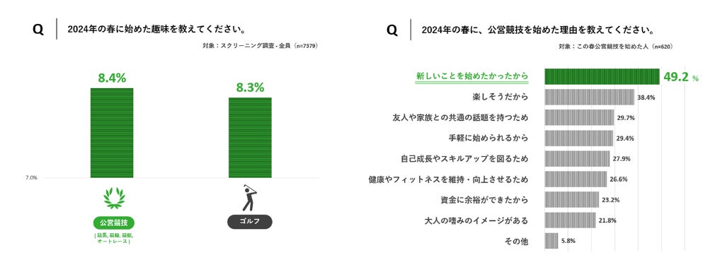 さらに「2024年の春に始めた趣味」について調査した結果、「ゴルフ」よりも「公営競技」が多い結果に。その理由として、約半数の49.2%が「新しいことを始めたかったから」と回答し、春のG1シーズンで盛り上がるタイミングに、新たなチャレンジとして公営競技を始めた方が多いようです。