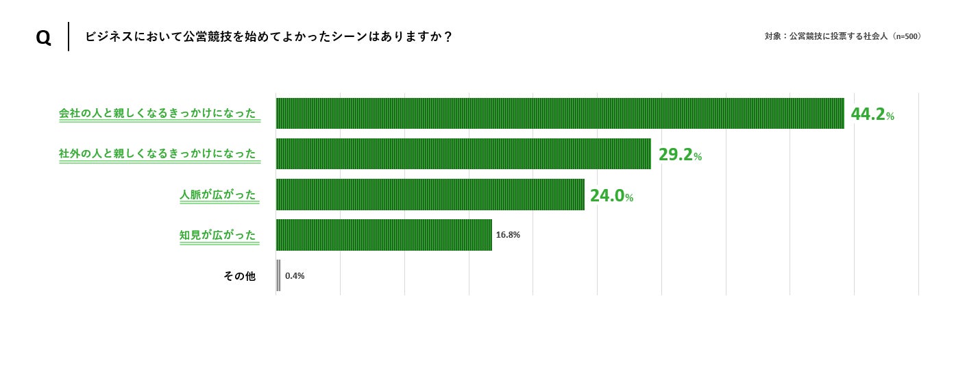 公営競技に投票する社会人500名を対象に「ビジネスにおいて公営競技を始めてよかったシーン」について調査したところ、44.2%が「会社の人と親しくなるきっかけになった」と回答。続いて、「社外の人と親しくなるきっかけになった」が29.2%、「人脈が広がった」が24.0%と、公営競技がビジネスシーンにおけるコミュニケーションツールの一つになっていることが分かりました。
