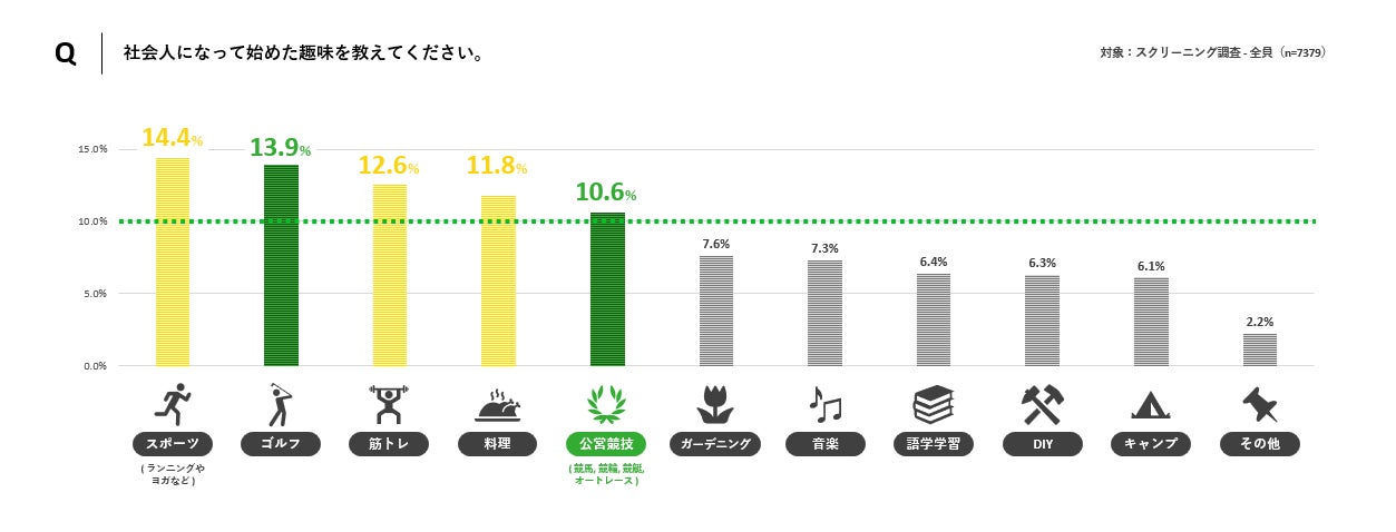 社会人7,379名を対象に「社会人になって始めた趣味」に関する調査を行いました。「社会人になって始めた趣味がある」と答えたアンケート回答者のうち、「スポーツ」が14.4%、「筋トレ」が12.6%、「料理」が11.8%と、気軽に始められる趣味が上位を占める中、社会人になってから始める方の多いイメージがある「ゴルフ」の13.9%に続いて、「公営競技」が10.6%と上位にランクインする結果になりました。