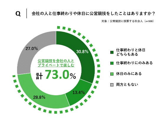 また、「会社の人と仕事終わりや休日に公営競技をしたこと」の有無について調査したところ、「仕事終わりと休日どちらもある」が30.8%、「仕事終わりにのみある」が13.4%、「休日のみにある」が28.8%と、アンケート回答者の73.0%がプライベートで同僚と公営競技を楽しんでいることが判明。このことから、公営競技が職場で良好な関係を築くためのきっかけになっているとうかがえます。