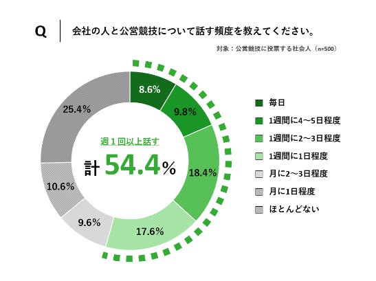 公営競技に投票する社会人500名を対象に「会社の人と公営競技について話す頻度」を調査したところ、「毎日」と回答した人が8.6%、続いて「1週間に4~5日程度」が9.8%、「1週間に2~3日程度」が18.4%、「1週間に1日程度」が17.6%と、アンケート回答者の54.4%が週に1回以上は職場で公営競技について会話していることが分かりました。