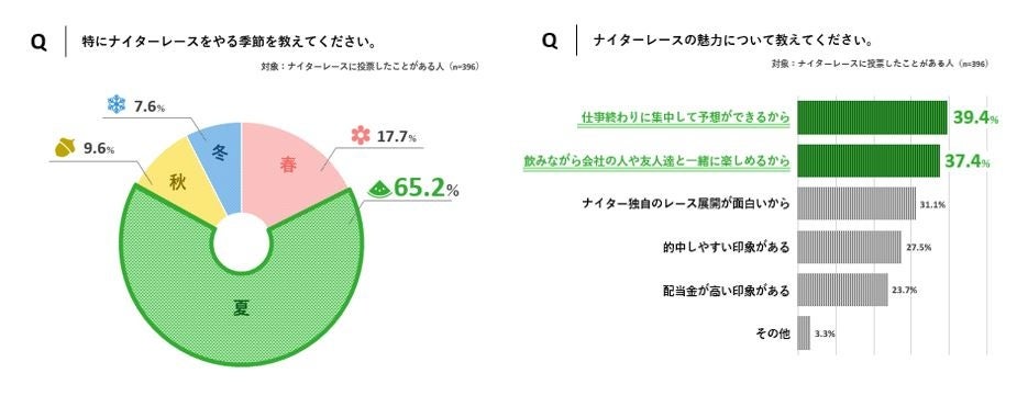 ④ 公営競技ユーザーの約65%が夏のナイターレースに投票。ナイターレースの魅力として「仕事終わりに集中して予想ができる」という回答が39.4%と最も多く、続いて「飲みながら会社の人や友人達と一緒に楽しめる」が37.4%と、仕事終わりに同僚と一緒に公営競技を楽しんでいる方が多いことが判明。