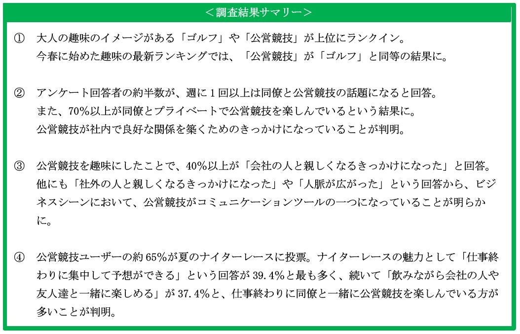 他にも「社外の人と親しくなるきっかけになった」や「人脈が広がった」という回答から、ビジネスシーンにおいて、公営競技がコミュニケーションツールの一つになっていることが明らかに。