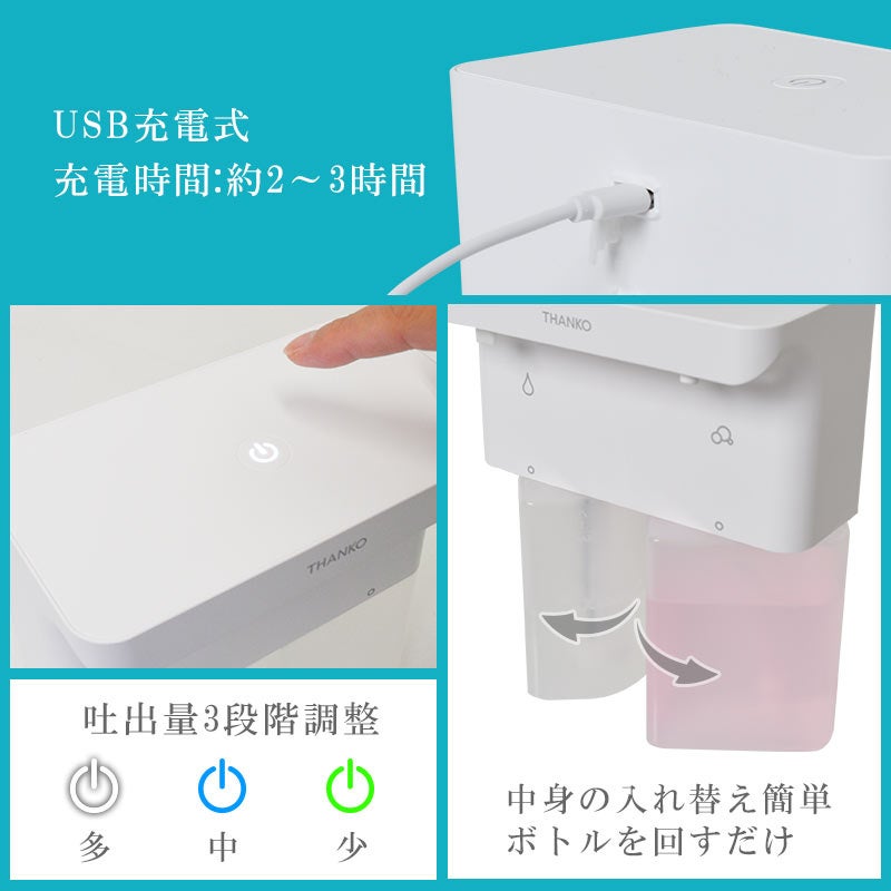 本体左側にキッチン洗剤などの液体を入れたボトルをセット、本体右側に泡タイプのハンドソープなどを入れたボトルをセット。ノズルの下に手やキッチンスポンジなどをかざすと自動で液体洗剤や泡が出てきます。出る量は本体天面のボタンで3段階に調整が可能。