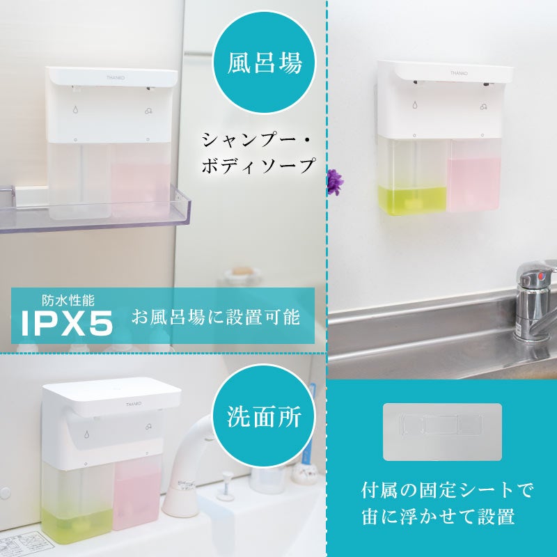 設置部分(ボトル部)の奥行きは約55mmとスリムで蛇口横の狭いスペースにも設置可能。IPX5※の防水性能でお風呂場にも安心して置けます。壁に貼り付けて設置できる粘着シートも付属。