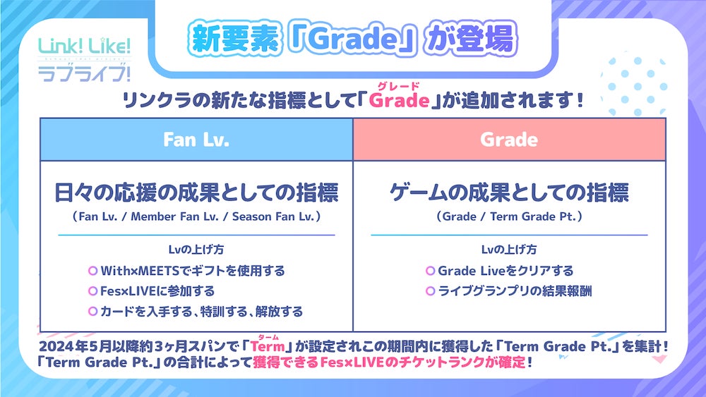 これに伴い、Fes×LIVEもTermの期間にあわせた開催に変更となり、この「Term Grade Pt.」の合計によって、獲得できるFes×LIVEのチケットランクが確定いたします。