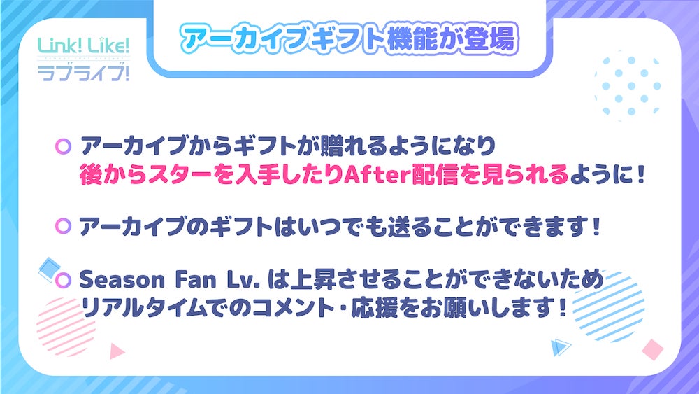 但し、アーカイブギフトでは、Season FanLv.は上昇させることができません。これまで通りSeason Fan Lvを上げるためには、生配信での視聴が必要となります。