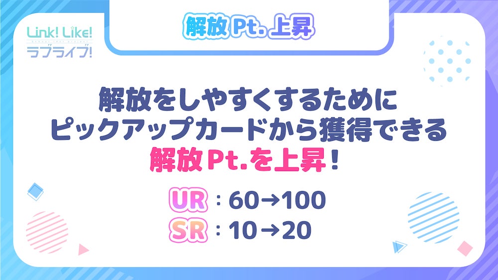 ガチャのラインナップのうちピックアップカードから入手できる解放Pt.が従来よりも上昇します。