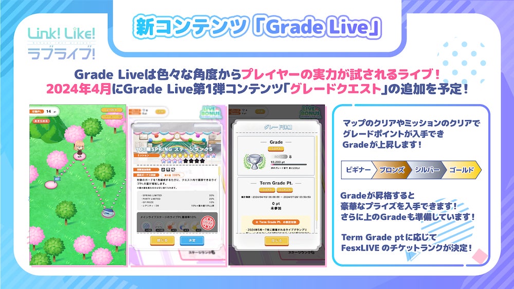 今回のアップデートにおけるメインは「リンクラ」スクールアイドルステージ(以下、スクステ)内に[Grade Live]が実装されます。また、従来よりも遊びの幅が広がるとともに遊びやすさを意識した様々な機能追加・調整などを実施いたします。
