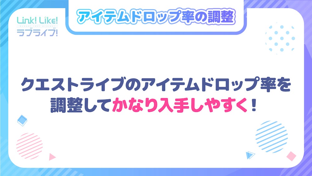 クエストライブにおけるアイテムのドロップ率が上昇し、カードのスキルLvアップのためのアイテムが入手しやすくなります。また既存のDRカード及び新たに実装予定の新DRカードを入手するために必要な「ユメノカケラ」や「ユメノハネ」も低確率で入手できるようになります。