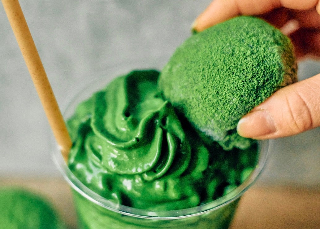なめらかな泡抹茶に大福をつけていただくと、堪らなく深い味わいになります。