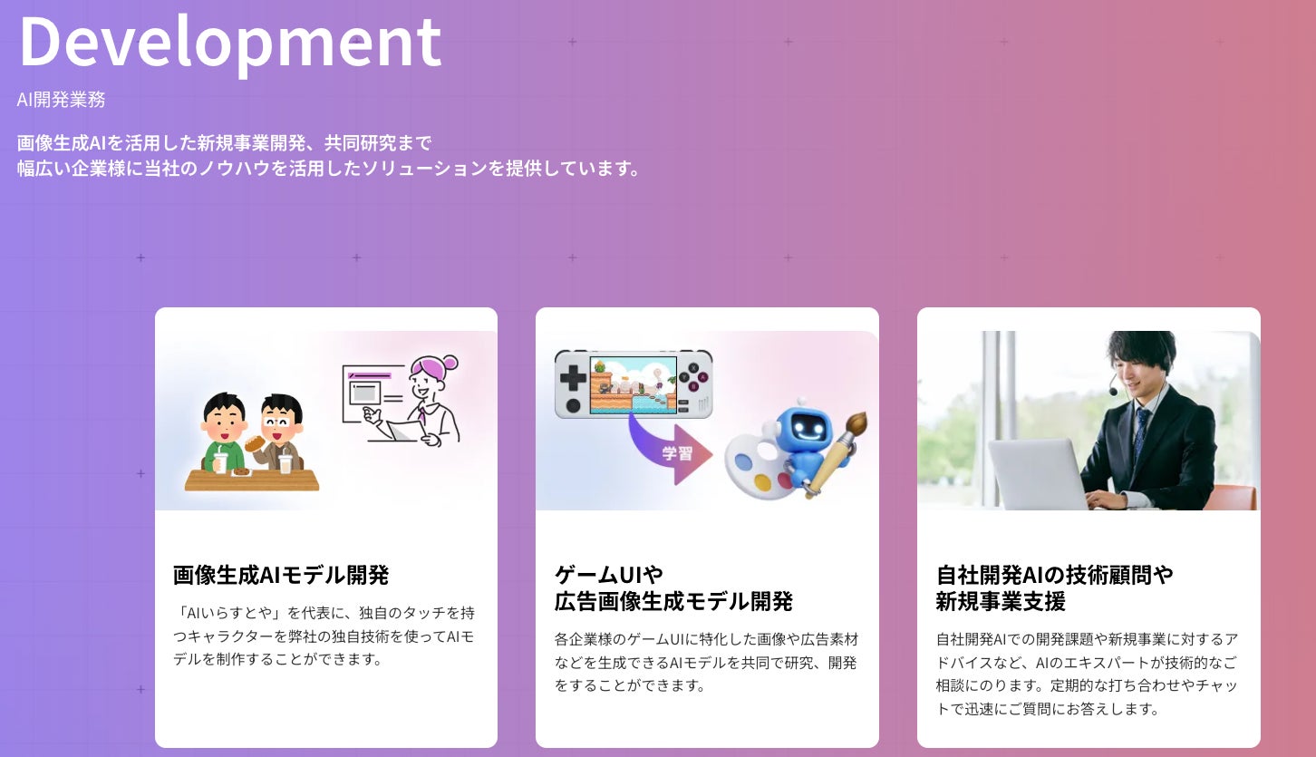 対企業向けに、画像生成AIを活用した新規事業支援、独自の画像生成AI技術を活用したキャラクター生成AIモデルなどのサービス提供を開始。
