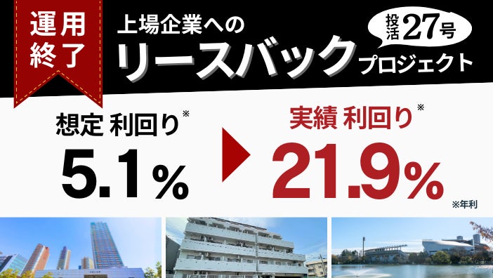 【投活27号リースバックプロジェクト】アップサイド配当で実績利回り21.9%となり早期償還/7月3日より30号の募集スタート