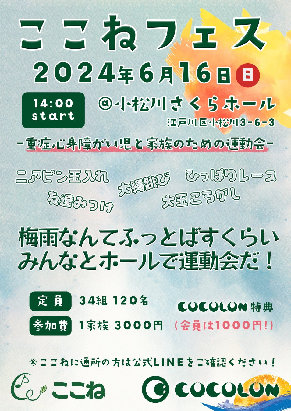 重症心身障がい児のと家族や支援者向けに学び・遊び・情報を提供をする「COCOLON」(運営:特定非営利活動法人EPO、東京都江戸川区、代表:齋藤えりか)は障がいや医療的ケアを抱えるお子様本人・きょうだい児・家族が一緒に参加できる運動会「ここねフェス」を6月16日(日)に開催します。本日5月20日(月)より一般に募集を開始します。