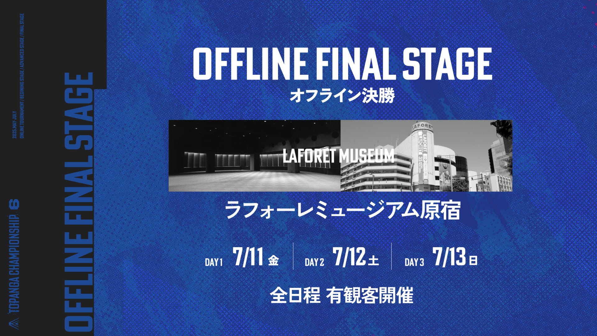 7月11日(金)から7月13日(日)の3日間で行われるオフライン決勝「OFFLINE FINAL STAGE」は、ラフォーレミュージアム原宿にて開催されます。「TOPANGA CHAMPIONSHIP」としては初めての有観客試合を実施します。