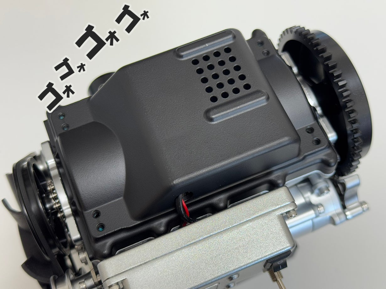 組み上げた達成感だけでなく、セルモーターを模したモーターでフライホイールを回転させ、エンジン全体が稼動します。