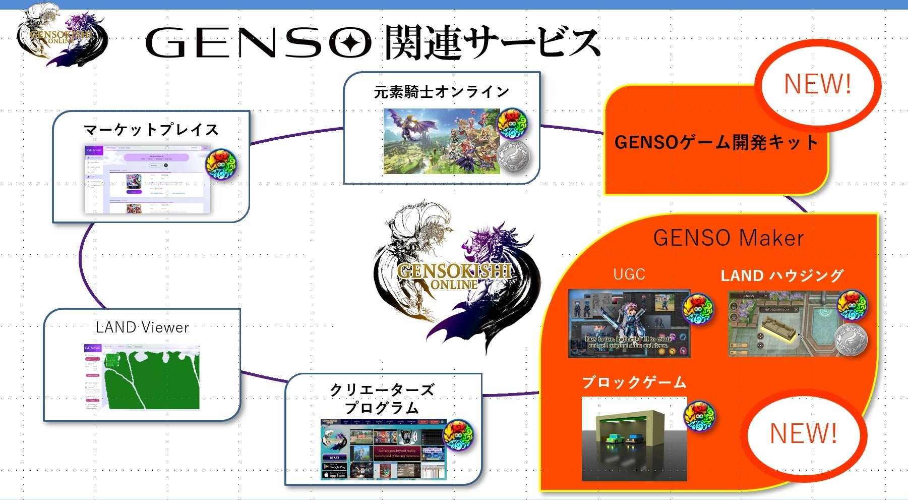 第一弾の「GENSO開発キットVer1」は2023年8月の公開を予定しており、主な機能としては、LANDにNPCを配置したり、モンスターを配置したりなど、独自のLANDを制作する事が出来るようになり、またそのLANDを他のユーザーも楽しむことが出来るようになります。