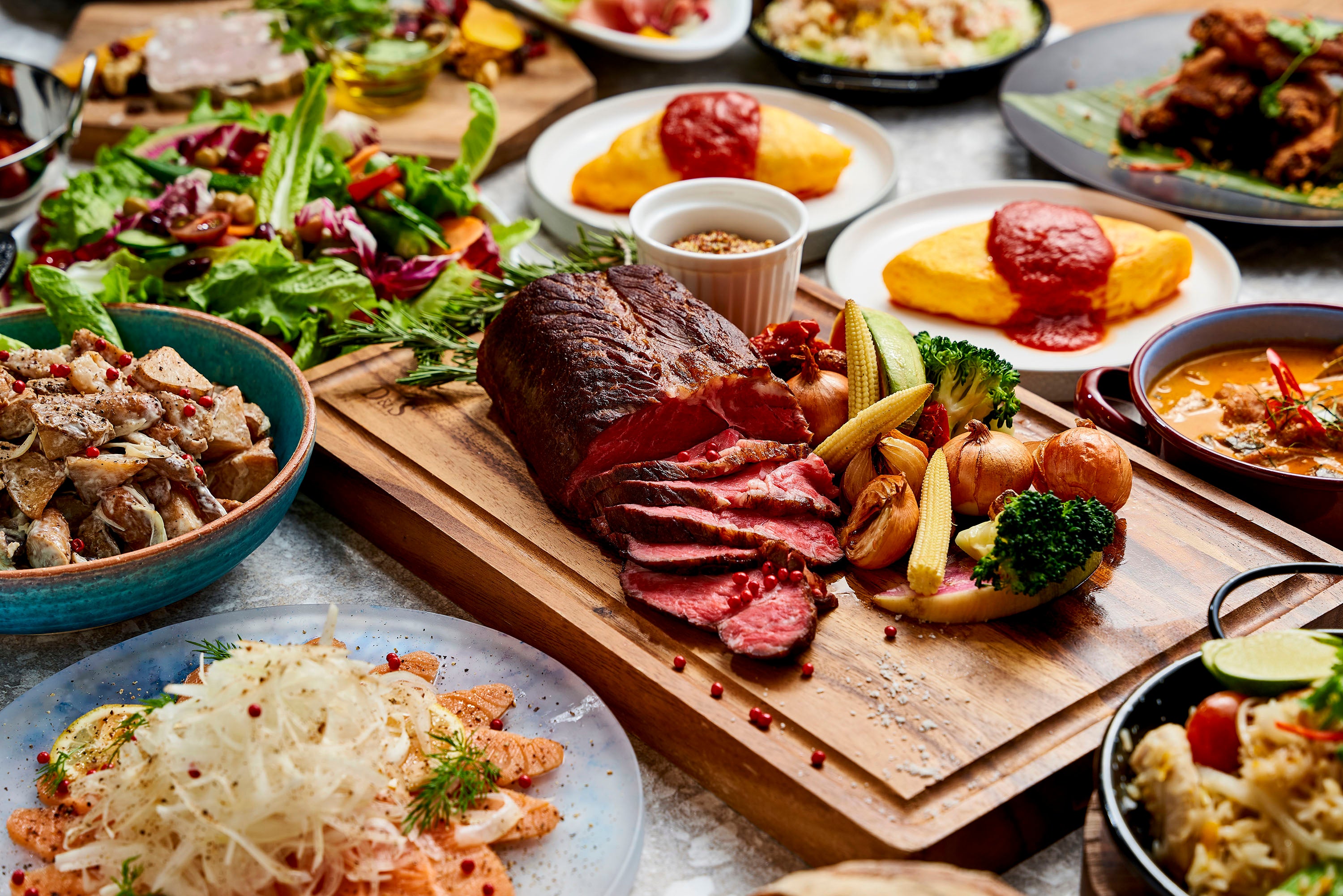 タイ料理やシーフード、和洋の味覚やデザートなど50種類以上のメニューがお好きなだけ満喫できる人気のランチビュッフェでは、7・8月の2か月間限定で特別メニューが登場します。シェフが目の前で切り分けるジューシーなローストビーフと、豚トロをナムチムジェウと呼ばれる酸味と辛みの効いたタレに漬け込みグリルした「コームーヤーン(タイ風豚トログリル焼き)」が追加料金なしで食べ放題。またデザートコーナーには通常のスイーツに加え、地産地消で大阪のロス農作物を使ったサステナブルなジェラートがお好きなだけお楽しみいただけます。