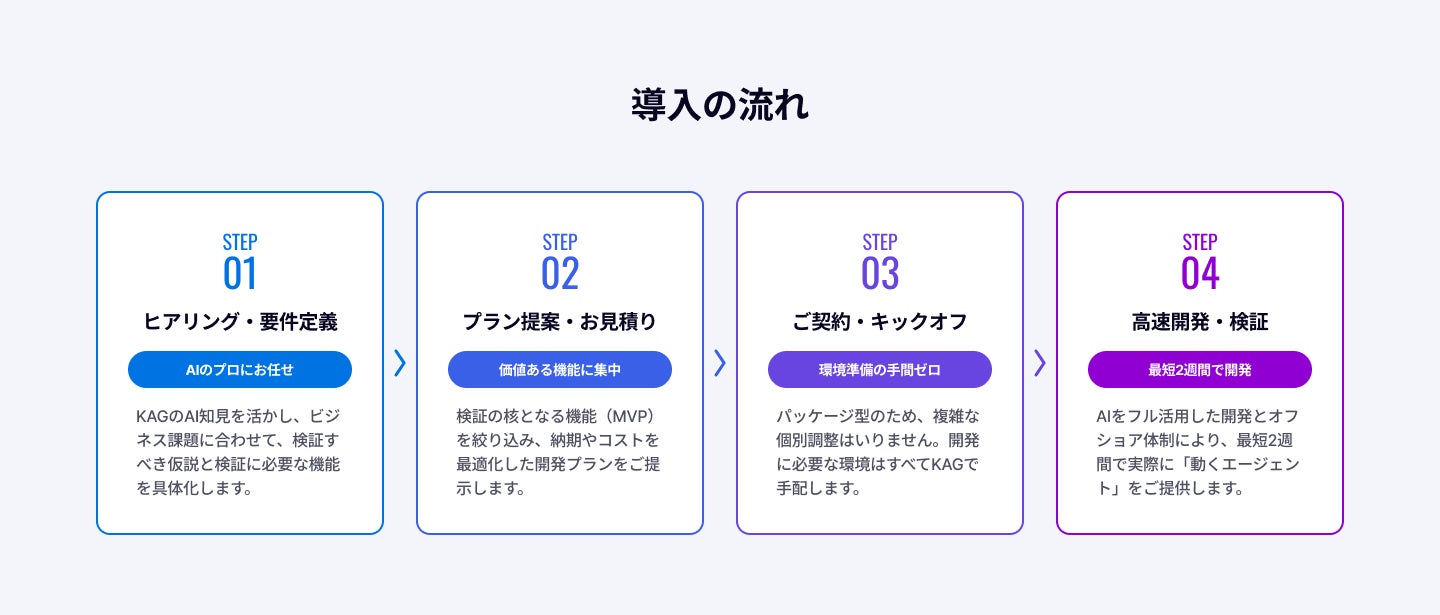 昨今、生成AIの業務活用への関心が高まる一方で、「自社の実業務にどこまで通用するかわからない」「導入効果が見えないまま高額な投資はできない」といった課題から、AIの本格的な導入に踏み切れないといった課題が多く存在しています。 KAGはこれまで培ってきたAIエージェント開発やAI駆動開発の知見と、過去10年以上に渡り共に開発で実績を積んできた強固なオフショアパートナーシップを掛け合わせることで、これらの課題を解決します。