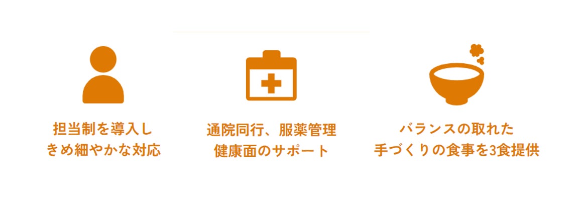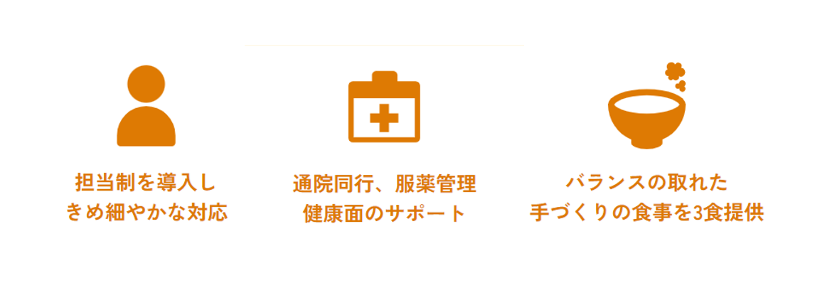 ・ご利用者様の健康状態を把握した職員が主治医と連携し、その時々の状態に合わせた健康サポートをしています