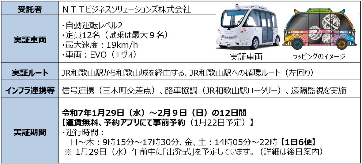 今回の実証運行については、和歌山バス株式会社とも連携し、前年度より更に運行ルートを拡大した約5.3㎞の循環ルートを『自動運転レベル2』で運行するとともに、信号連携等のインフラ連携や遠隔監視を実施するなど、将来の自動運転の実装を目指した実証を行います。