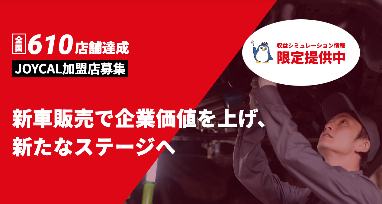 ジョイカルジャパンは、自動車販売において、他社にはできない商品を数多く展開しております。今現在、整備、鈑金だけで自動車の販売をしたいけど、どうすれば良いか分からない、販売はしているが、今までの利益がでない、新車の仕入れが難しい。集客が出来ないなど、ジョイカルジャパンでは、商品の提供をはじめ、システムの提供から店舗ごとに合わせた売れるためのノウハウ提供から問題解決など徹底的にサポートも行います。