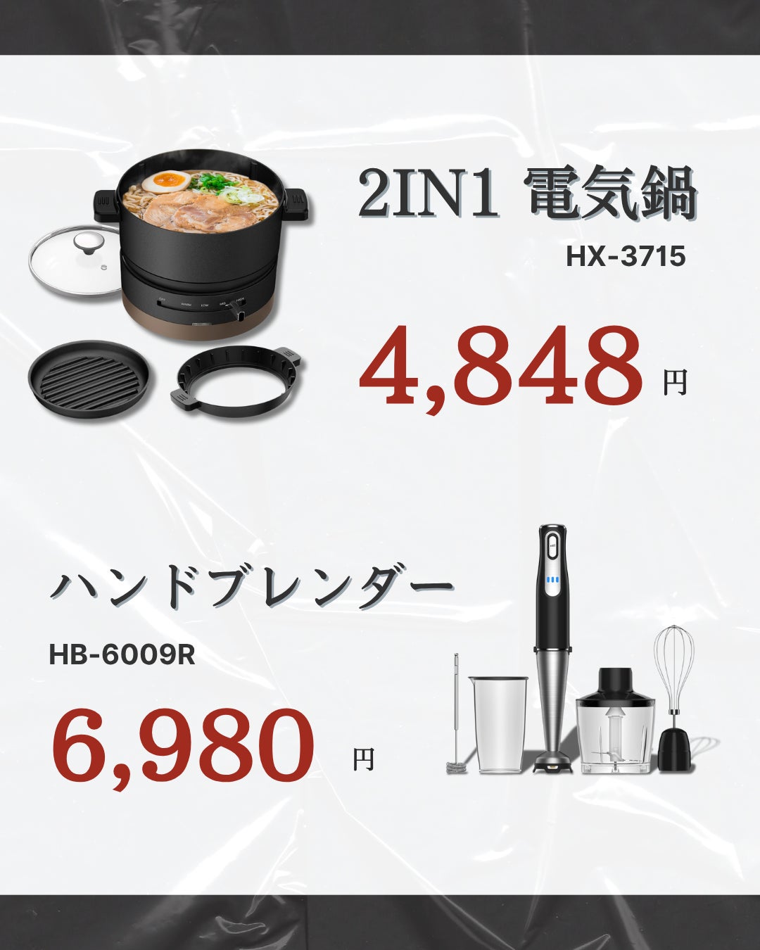 さらに、忙しい日の時短調理には1台6役のハンドブレンダーが活躍し、電気鍋があれば一人の食事も手軽で楽しいひとときになります。