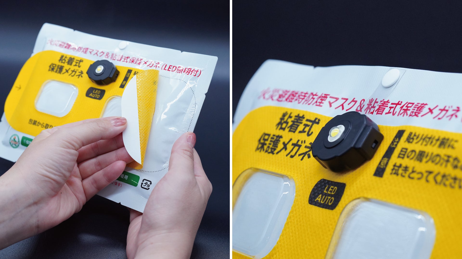 フィルムから剥がすと自動で点灯するLEDライト付きで、停電時や火災の煙による視界不良の中でも安全に退路を確保できます。