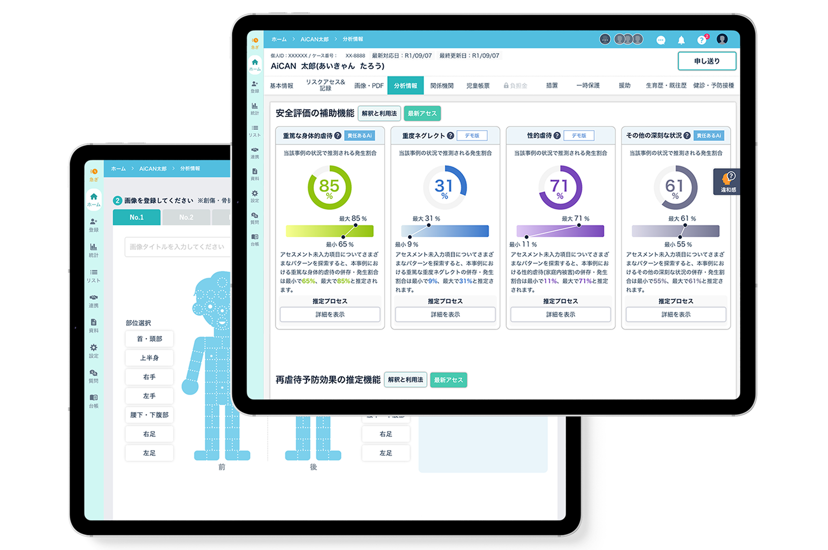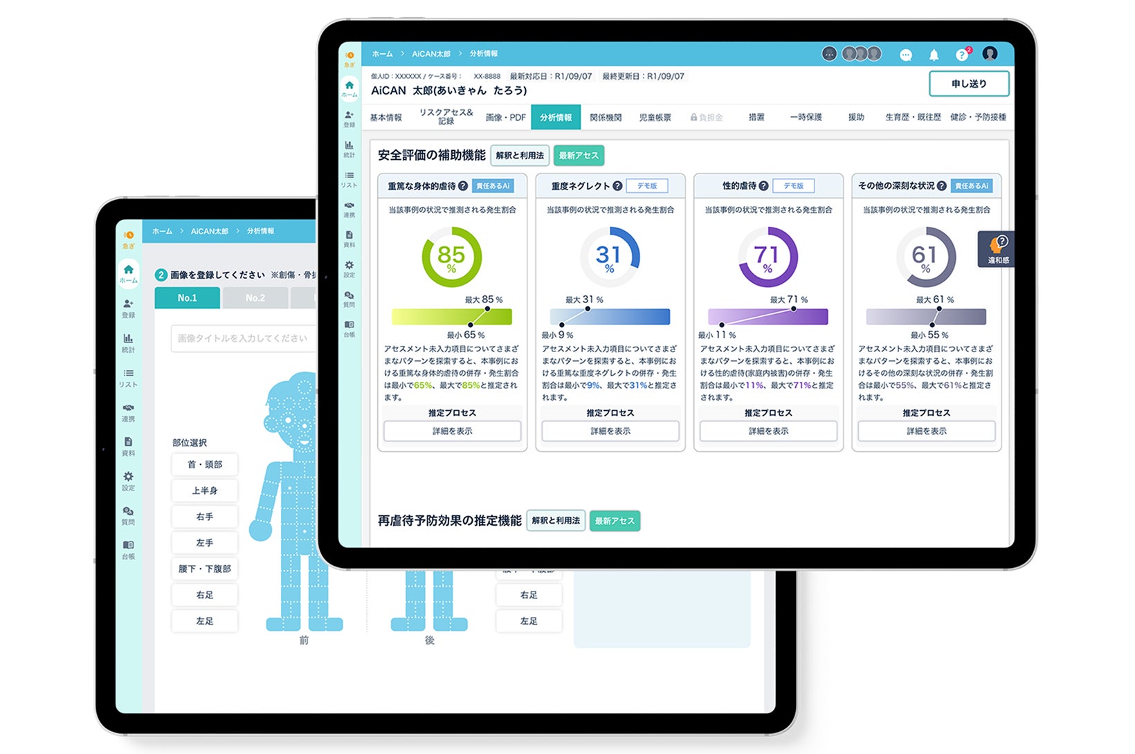 ・過去のデータをもとに、虐待の併存リスクや優先的に調査すべき項目を表示し、判断対応をサポート