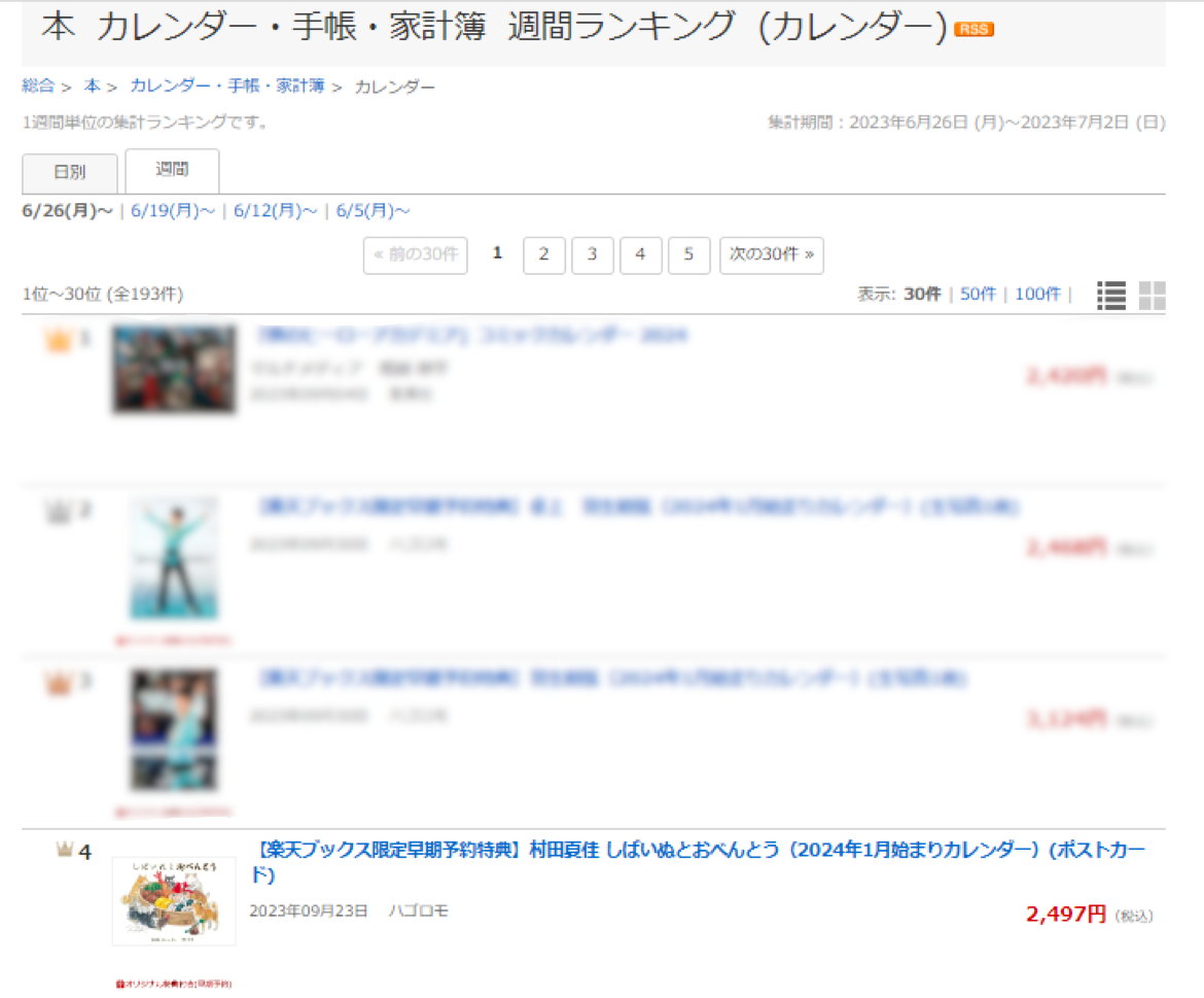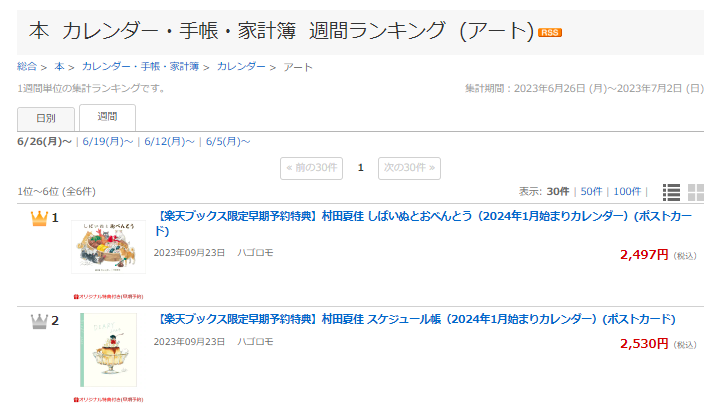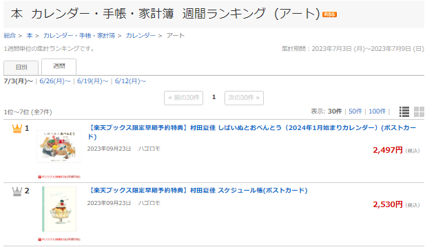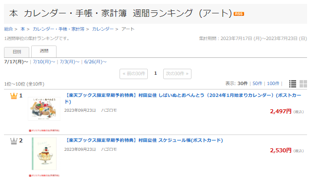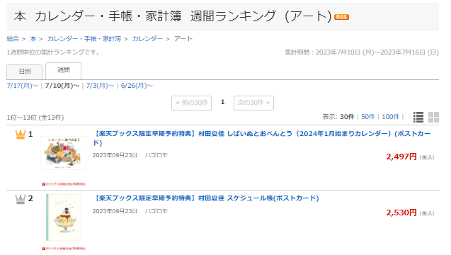 楽天ブックスのカレンダー週間ランキング(アート部門)、4週連続で1位と2位にランクイン。首位独走中です。