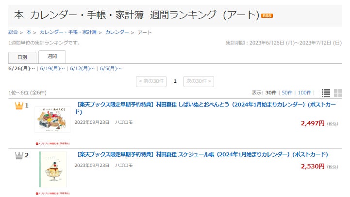 カレンダーランキング(アート部門)、4週連続で1位と2位にランクイン!