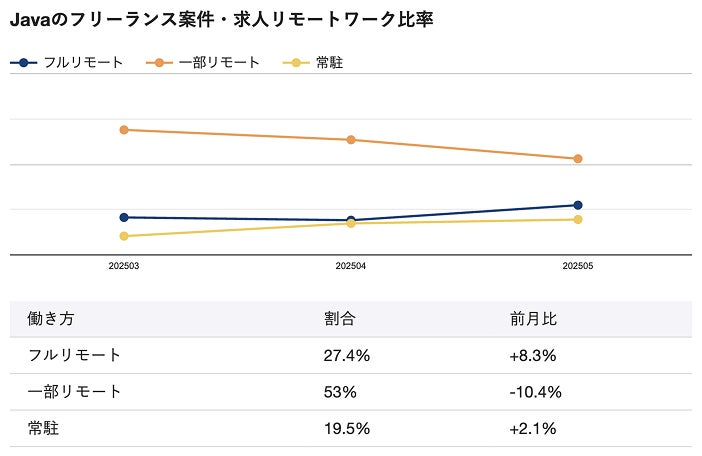 Java案件のフルリモート割合(27.4%)は前月比+8.3%と大幅に増加したものの、一部リモートが過半数を占める状況は続いています。