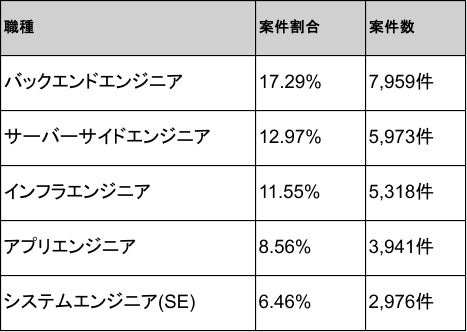 職種別の案件割合は、バックエンドエンジニアが17.29%、サーバーサイドエンジニアが12.97%、インフラエンジニアが11.55%が中心で、Spring BootとCI/CDを武器にしたフルスタック志向の人材が重宝されています。